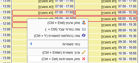 אפשר לסמן מספר משמרות על ידי לחיצה על מקש ה CTL במקלדת ובזמן שהמקש לחוץ ניתן לבחור עוד משמרות .