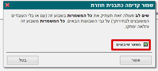 "שים לב פעולה זאת תעתיק את כל המשמרות בשבוע זה (עם או בלי העובדים המשובצים לבחירתך) על גבי השבועות הבאים. כל המשמרות משבוע זה והלאה ימחקו." (ראה תמונה ב)